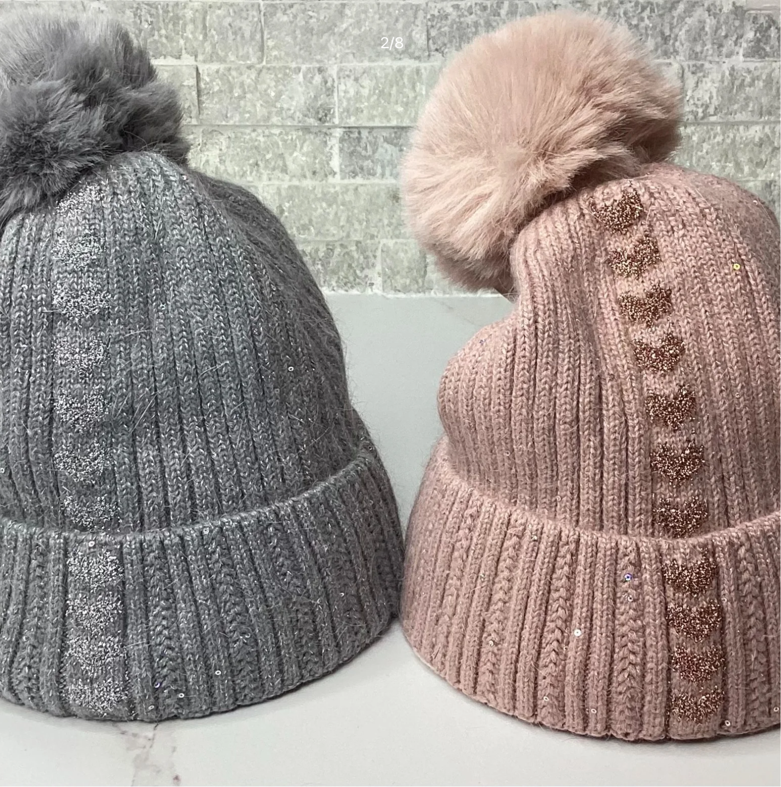 Stay warm and stylish with the Abbi Shimmering PomPom Plush Lined Hat! This hat features a soft and cozy fleece lining, perfect for keeping you warm during the colder months. The large PomPom on top adds a playful touch, while the shimmering hearts pattern adds a touch of fun to your look. With great stretch, this hat is both comfortable and chic.