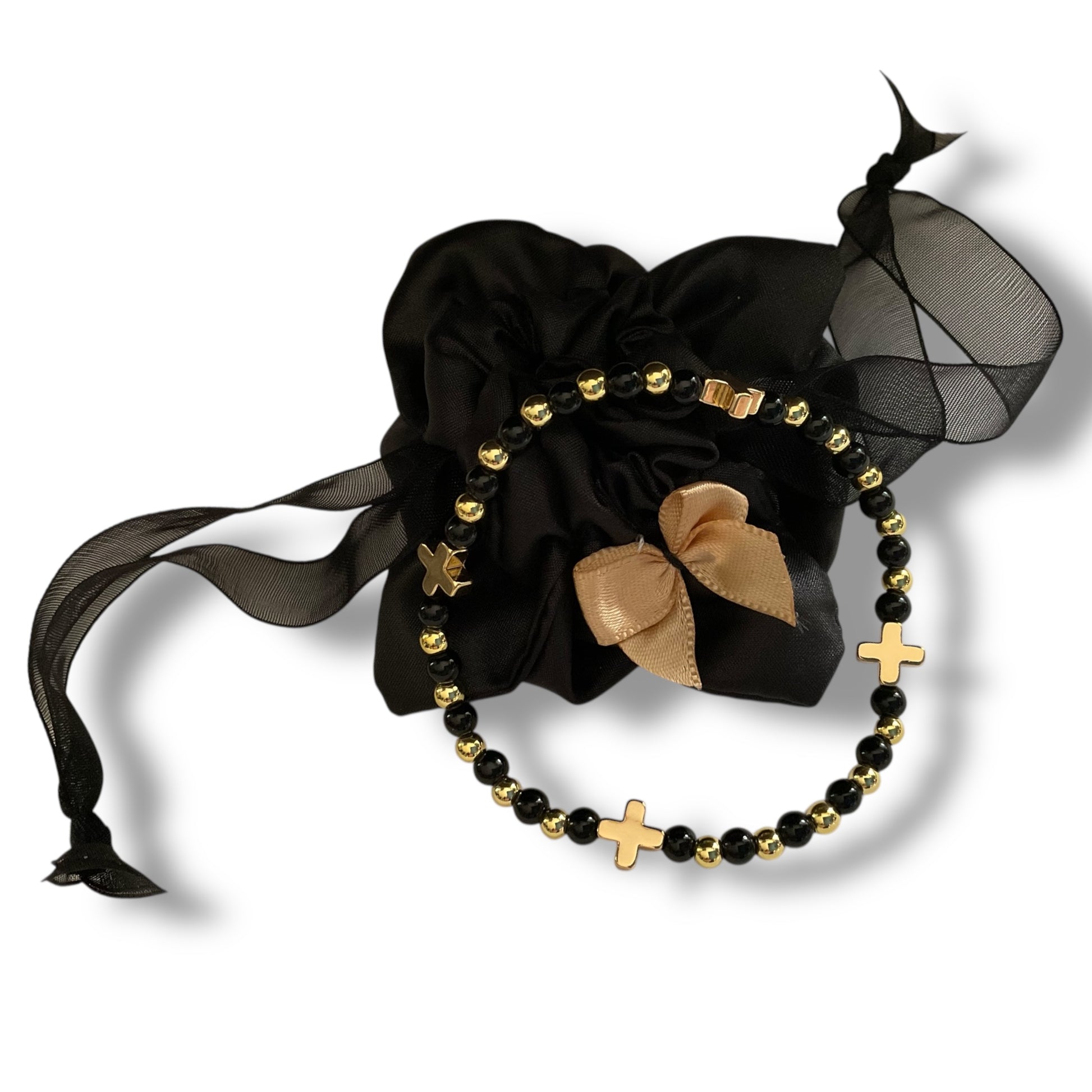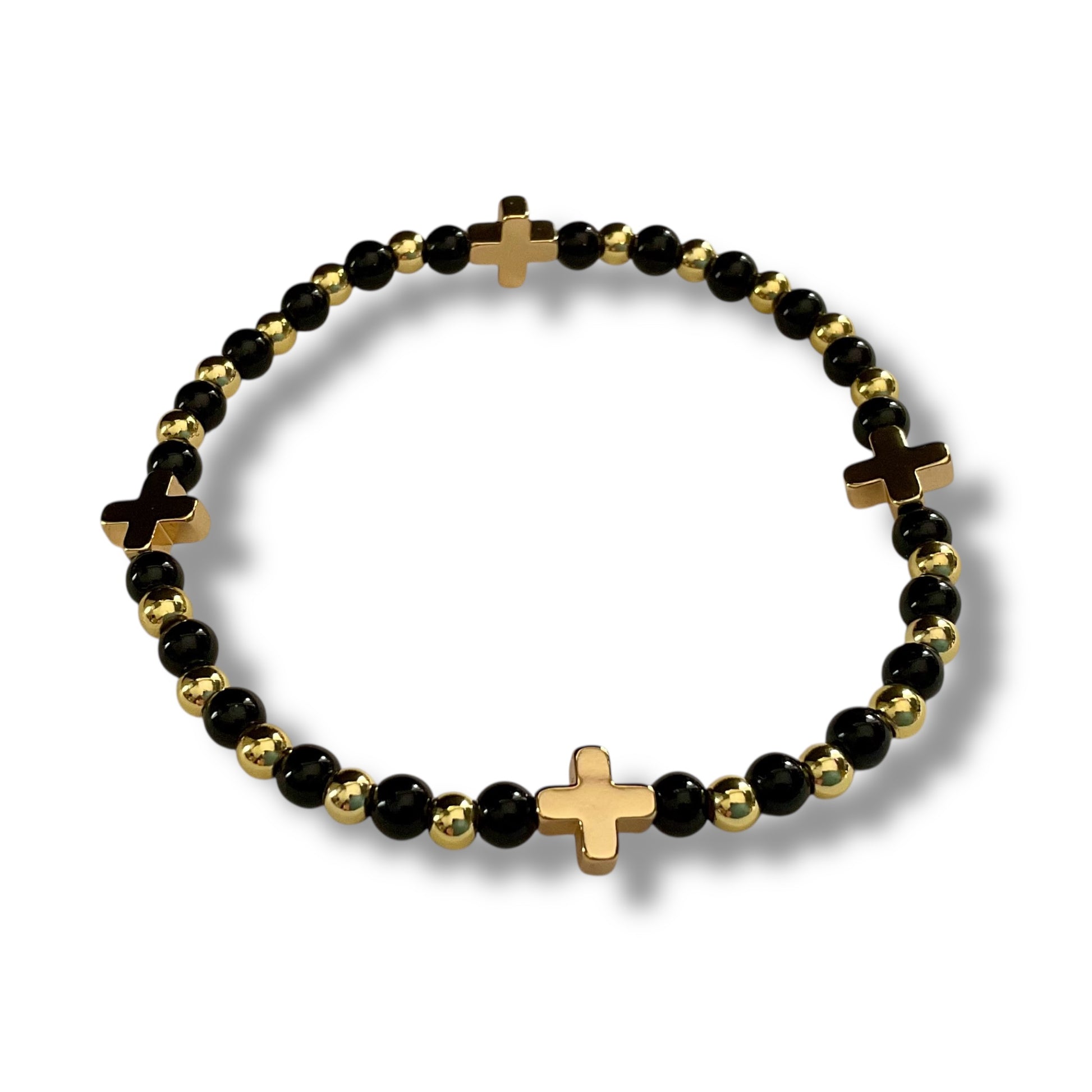 Handmade with glossy jet-black beads and polished gold accents, the Noir Harmony Bracelet brings a striking balance of bold contrast and timeless elegance. Finished with 4 gold cross charms, it’s a beautifully refined piece that sits perfectly alone or layered within a gold bracelet stack.
