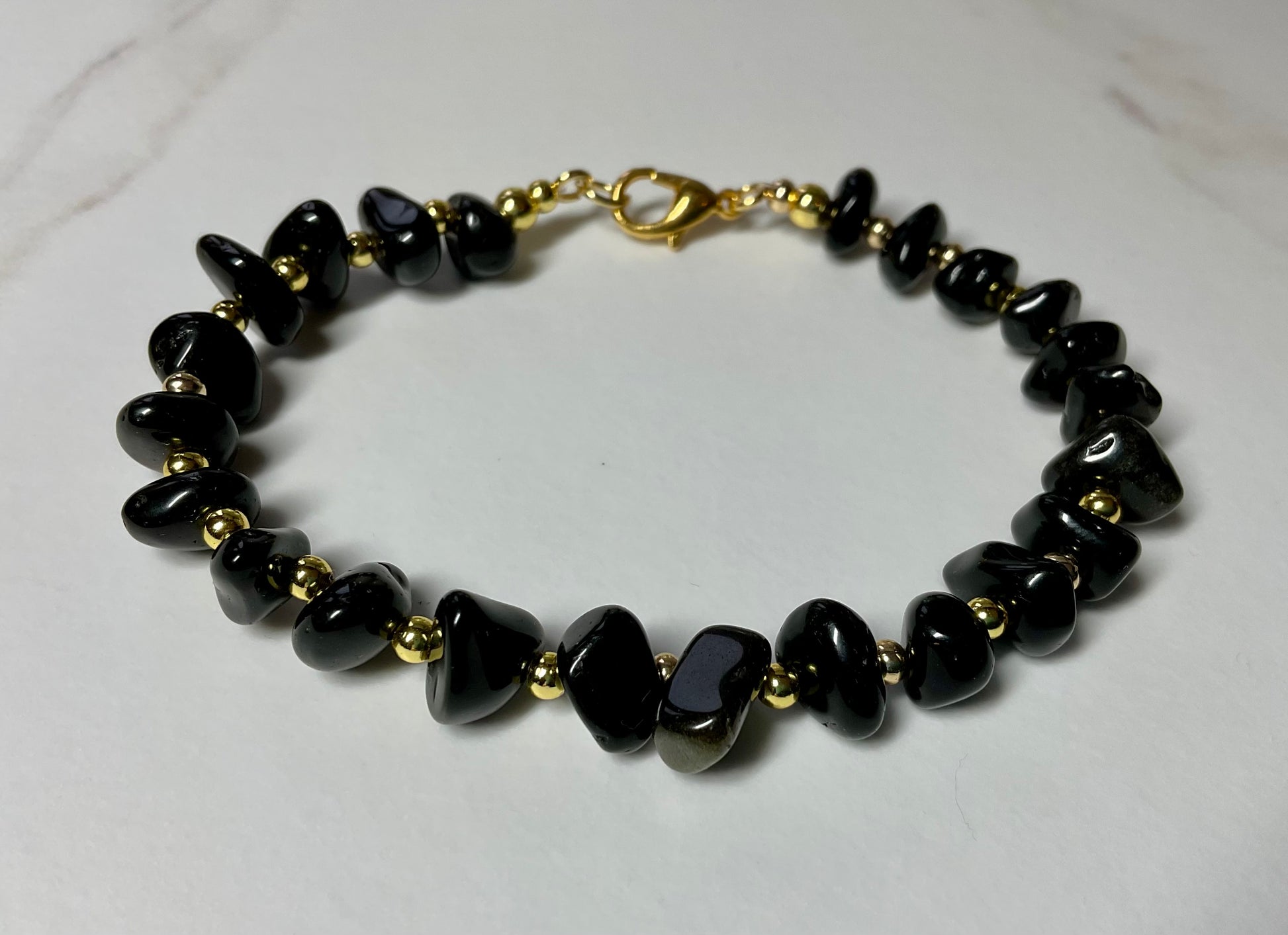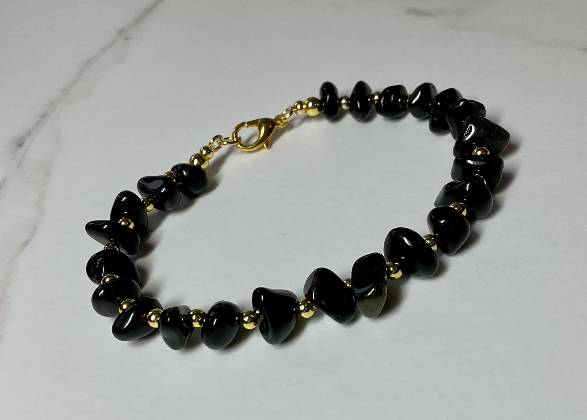 Elevate your everyday look with this stunning handmade bracelet crafted from natural black onyx chip beads paired with 18k gold-plated accents. Each stone is beautifully unique, giving the bracelet a luxurious, organic feel, while the gold beads add a touch of elegance and shine.
