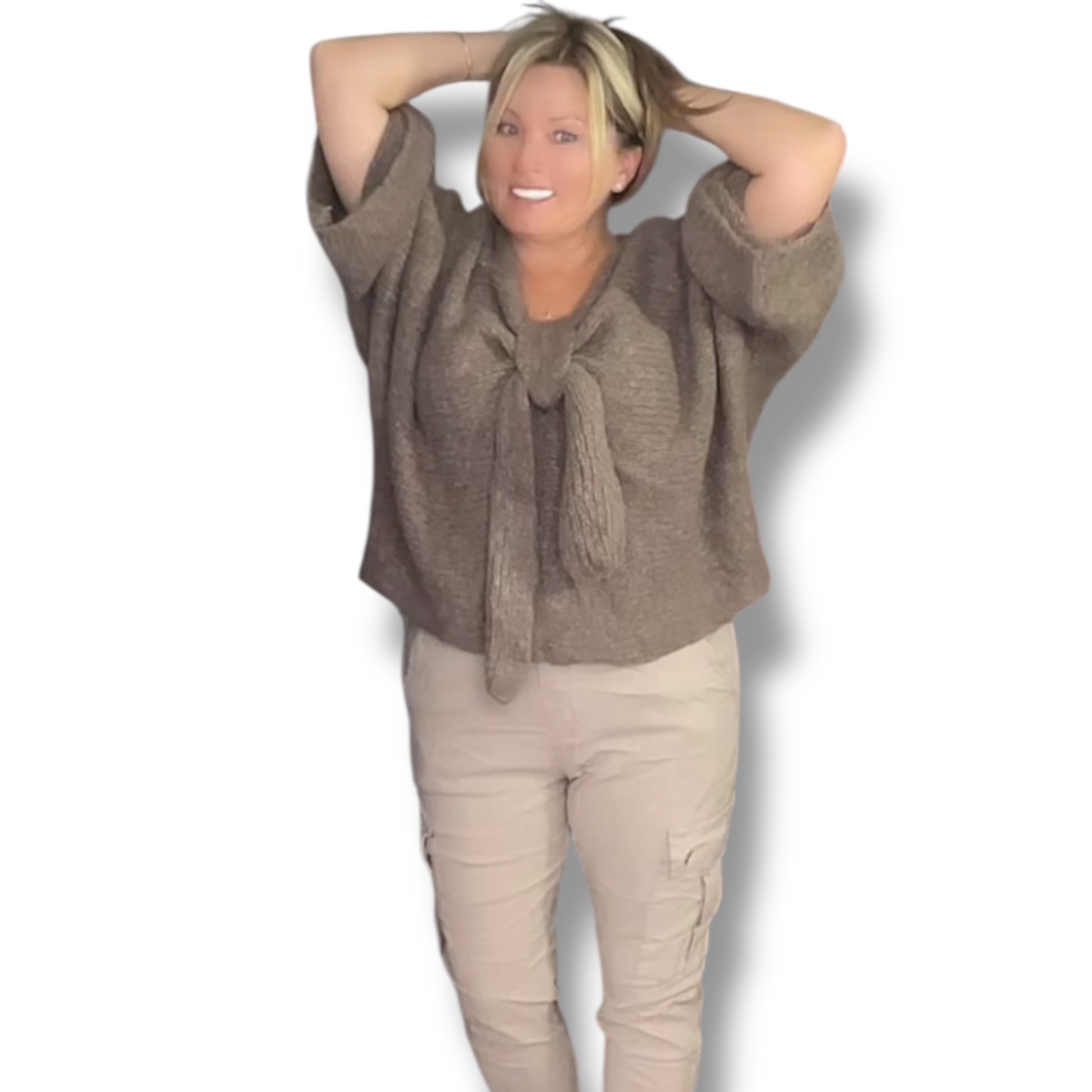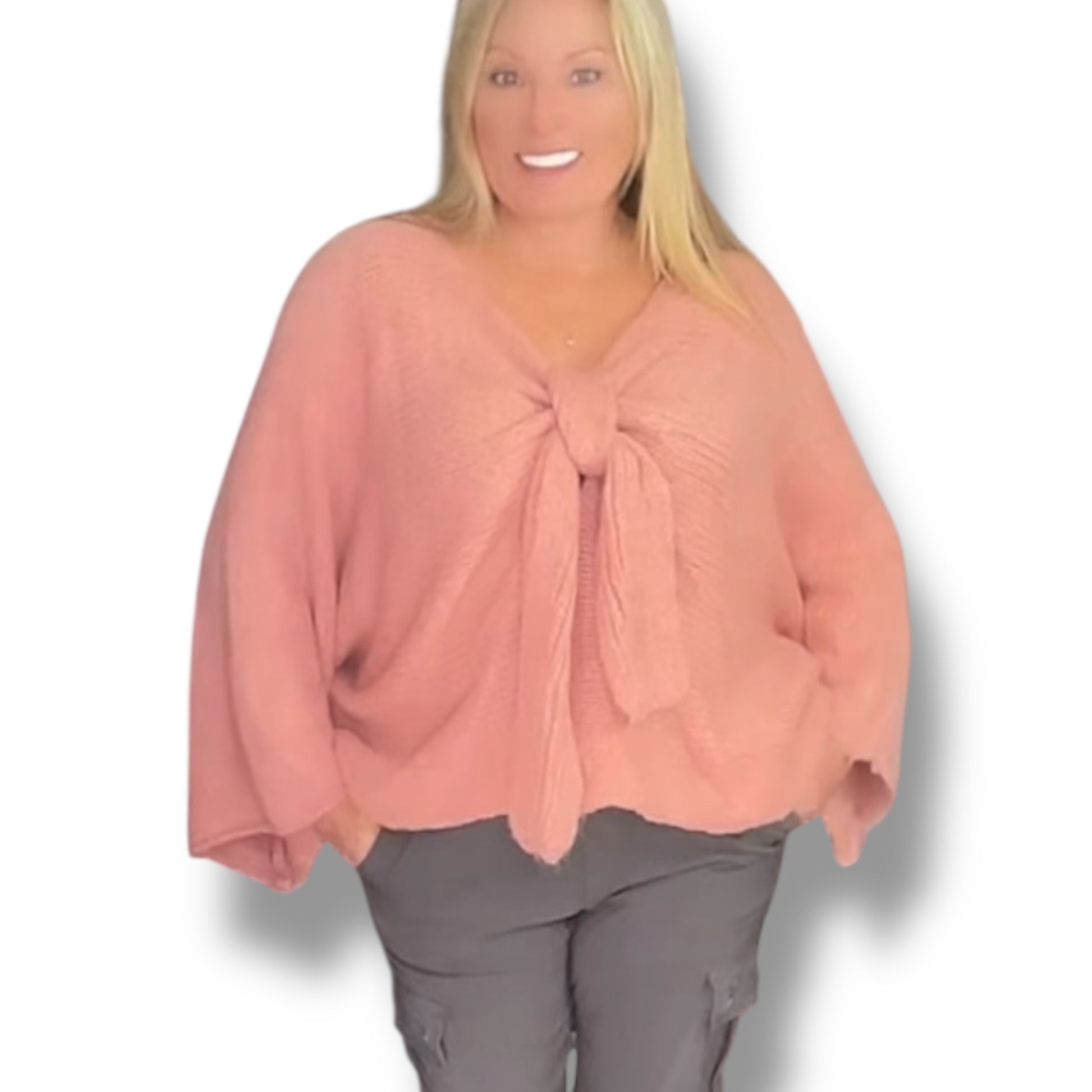 Get ready for some serious weekend vibes with our Bow Front Knitted Jumper (Andi). Made from the softest materials, this cozy jumper features a big bow on the front and long, wide sleeves for a playful and stylish look. Perfect for keeping warm and looking stylish, whether you're a size 8 or 18.
