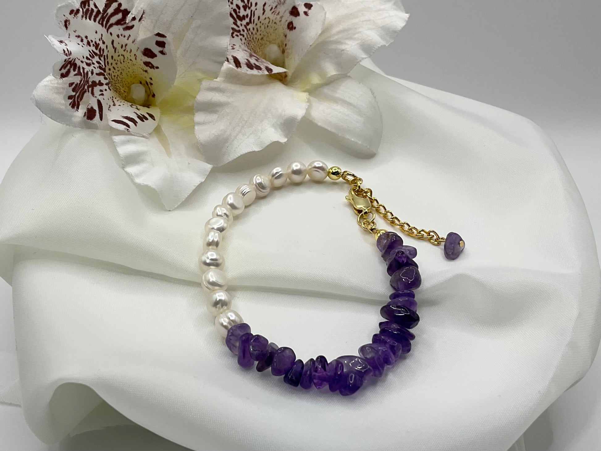 A beautiful combination of natural amethyst chips and freshwater pearls, finished with gold-plated details and an adjustable fastening.