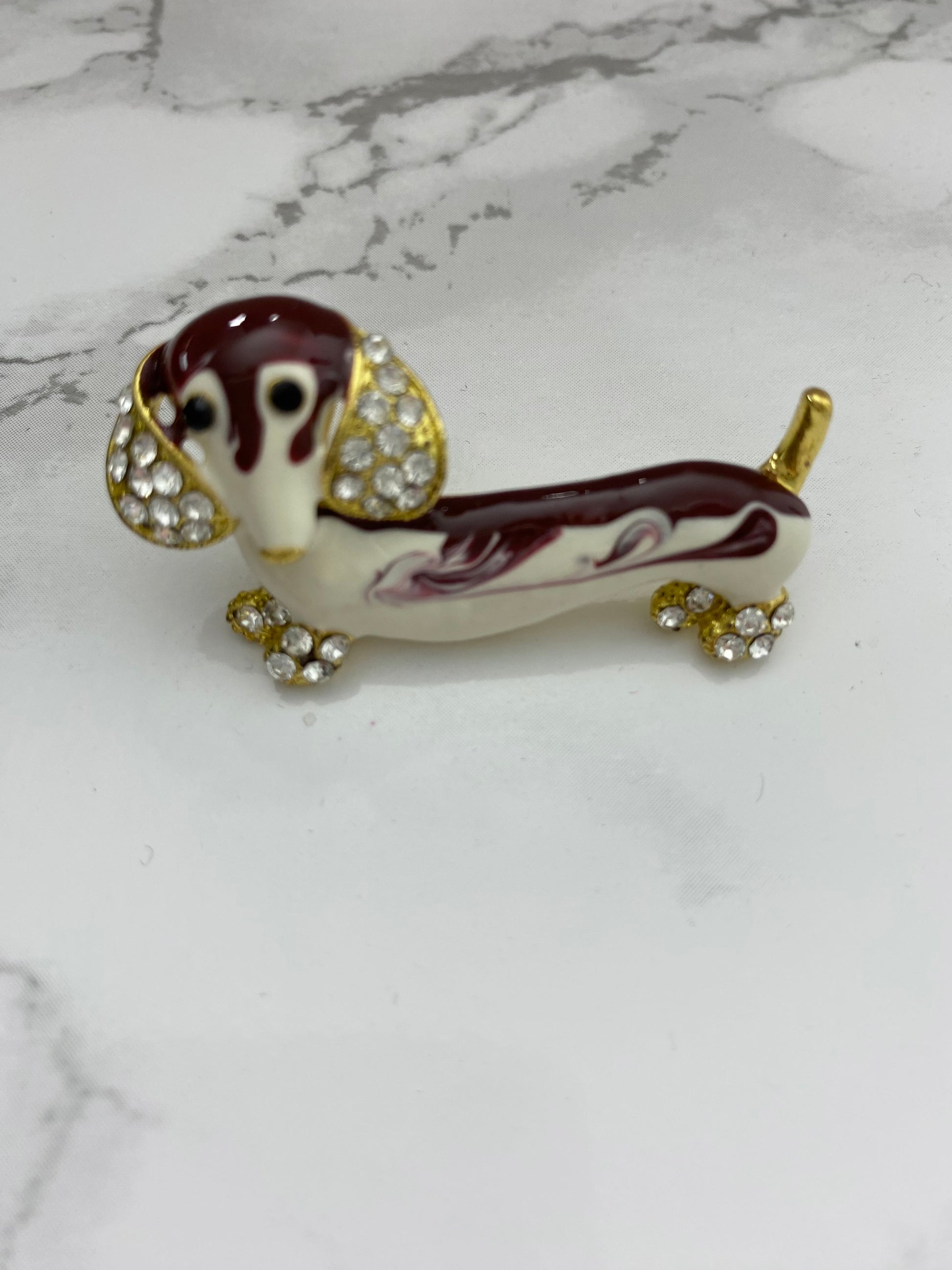 Introducing the Dash Hound Brooch! This charming pin features a gold color and whimsical gemstones for the feet and ears. Fasten it to your outfit and add a touch of fun to any ensemble. (Pin faster, pun intended!)