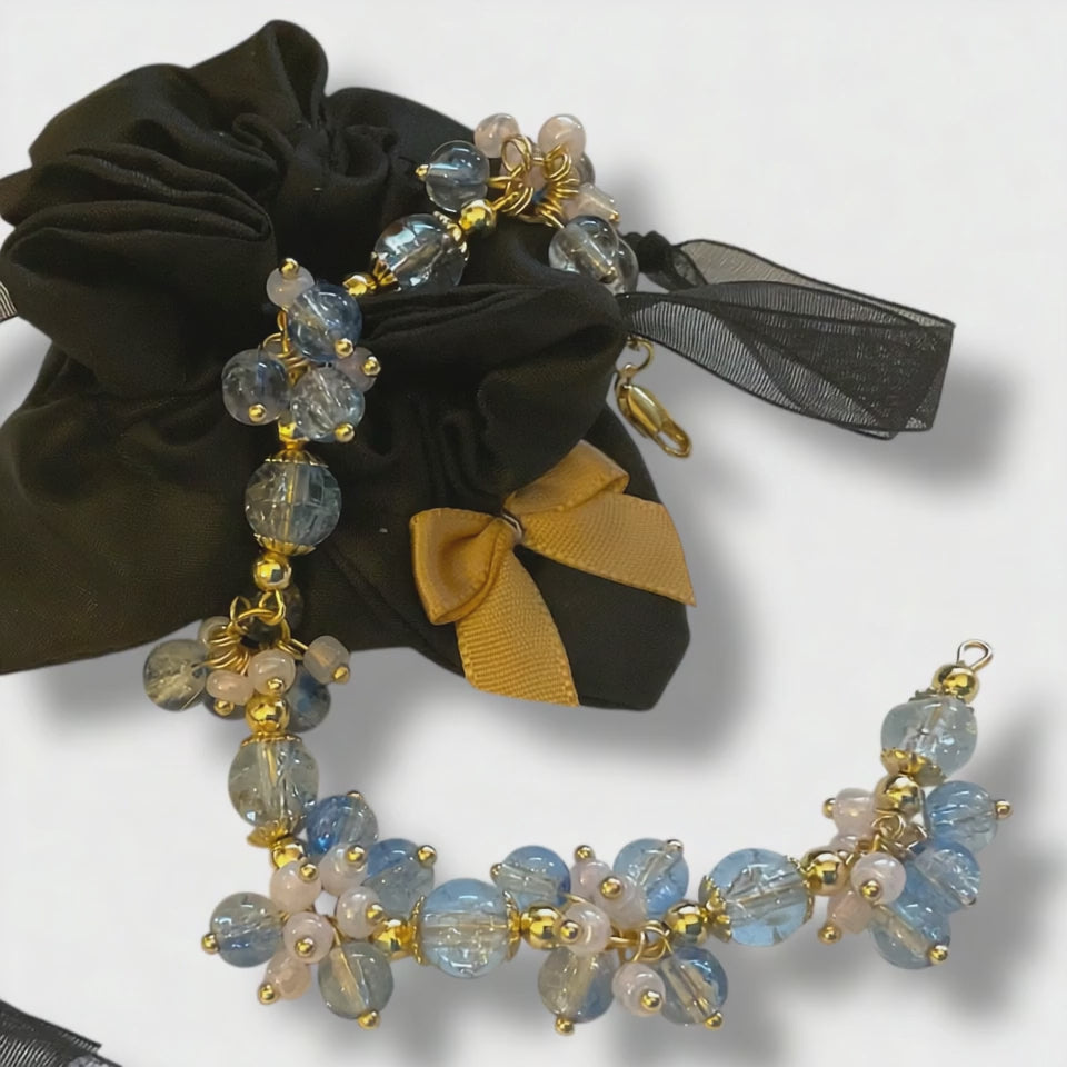 Step into a world of soft winter sparkle with the Frosted Skies Charm Bracelet — a dreamy cluster of icy blue crackled glass beads, delicate blush accents, and luxurious 18k gold-plated details. Every bead catches the light beautifully, creating a gentle shimmer that feels both elegant and effortlessly wearable.