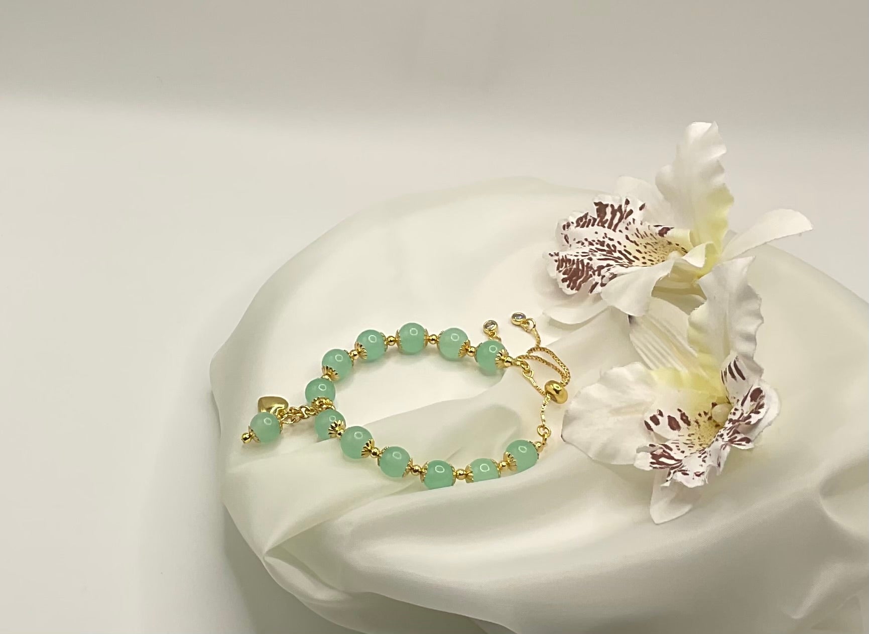 A delicate bracelet made with soft green natural stone beads, finished with gold-plated spacers and an adjustable slider fastening.