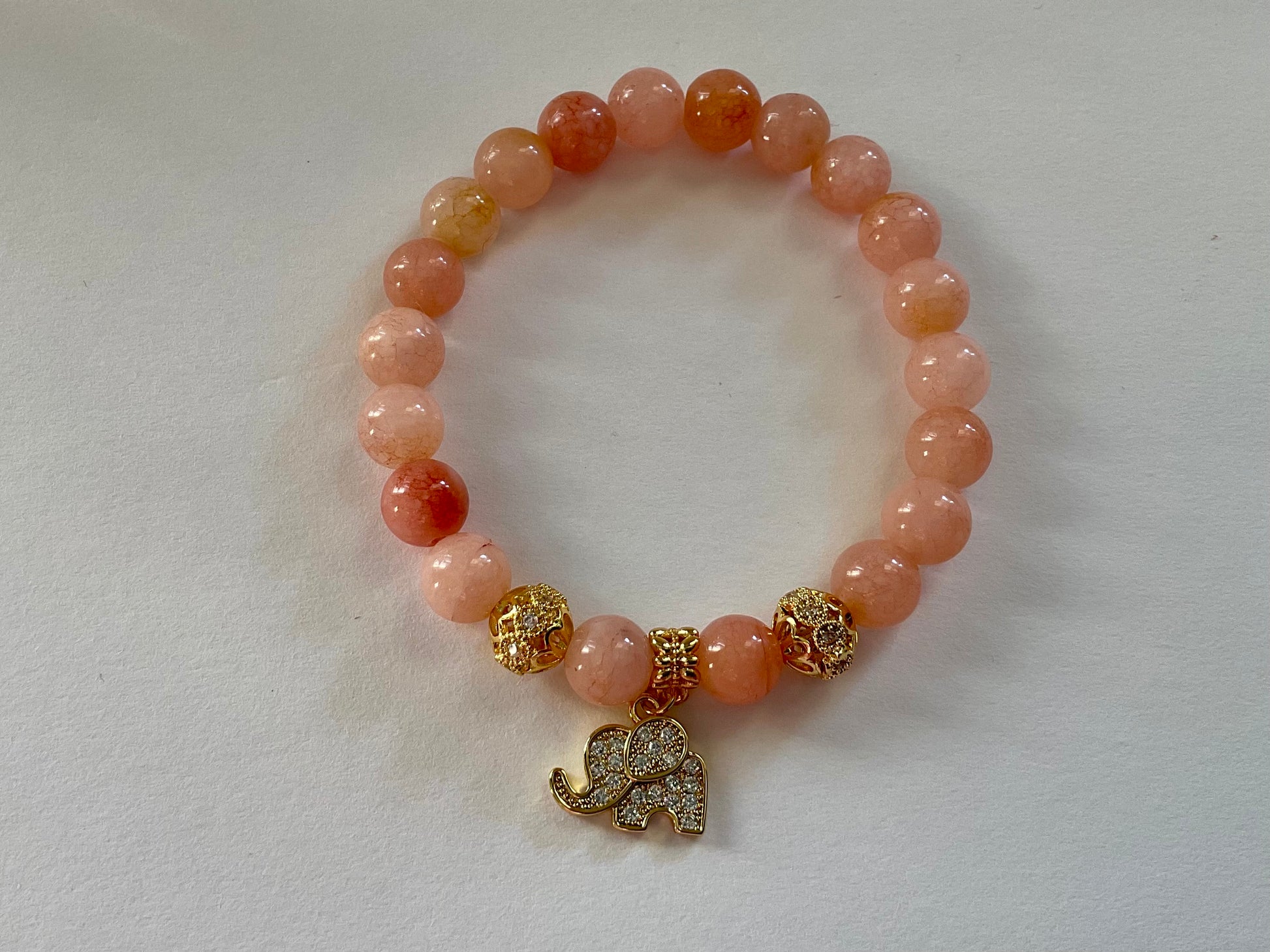 This handmade stretch bracelet features soft pink aventurine gemstones, known for their calming and heart-healing properties, paired with a delicate elephant charm symbolising strength, protection and good fortune.