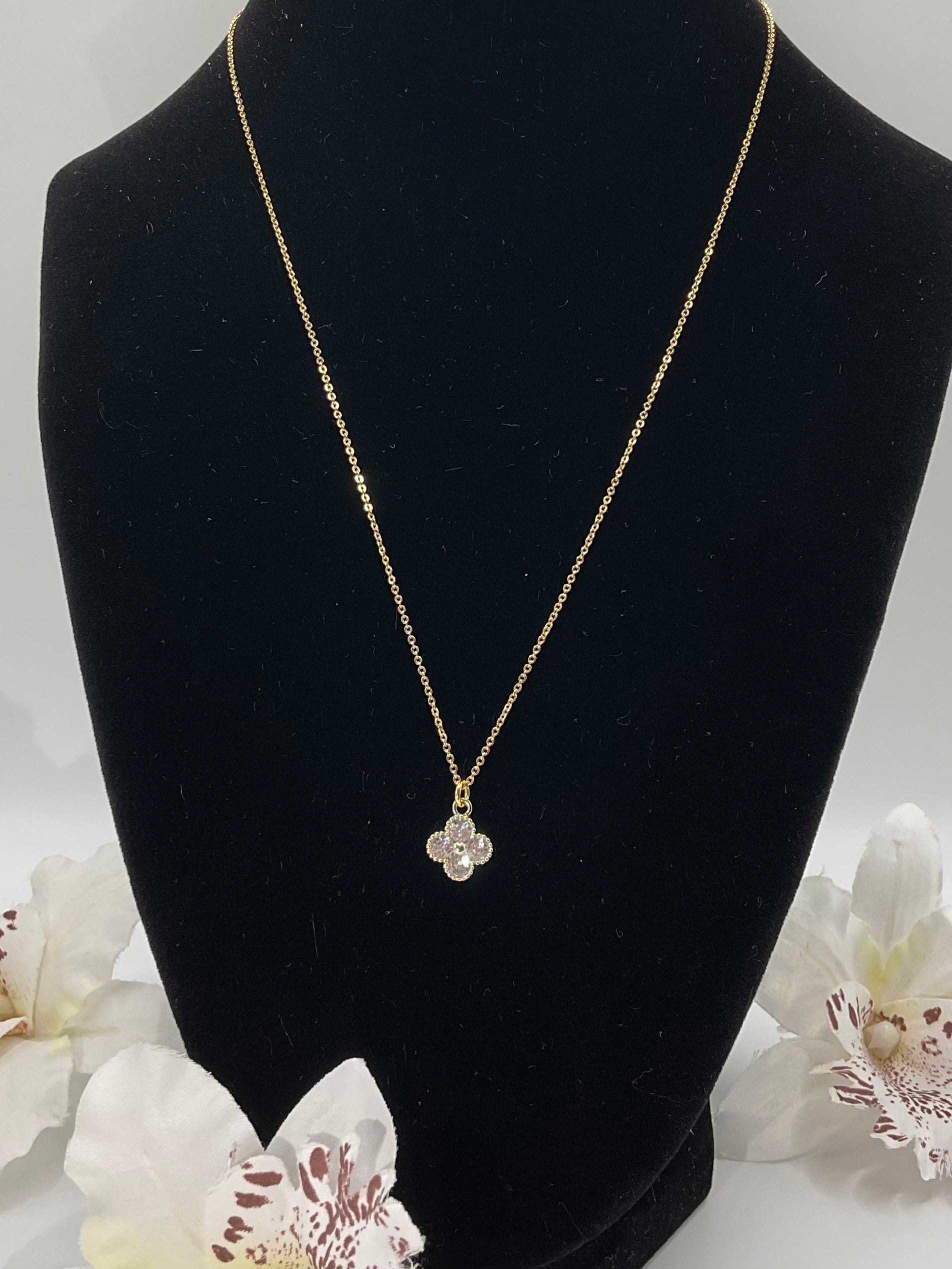 A delicate 18k gold plated chain finished with a sparkling cubic zirconia clover charm.