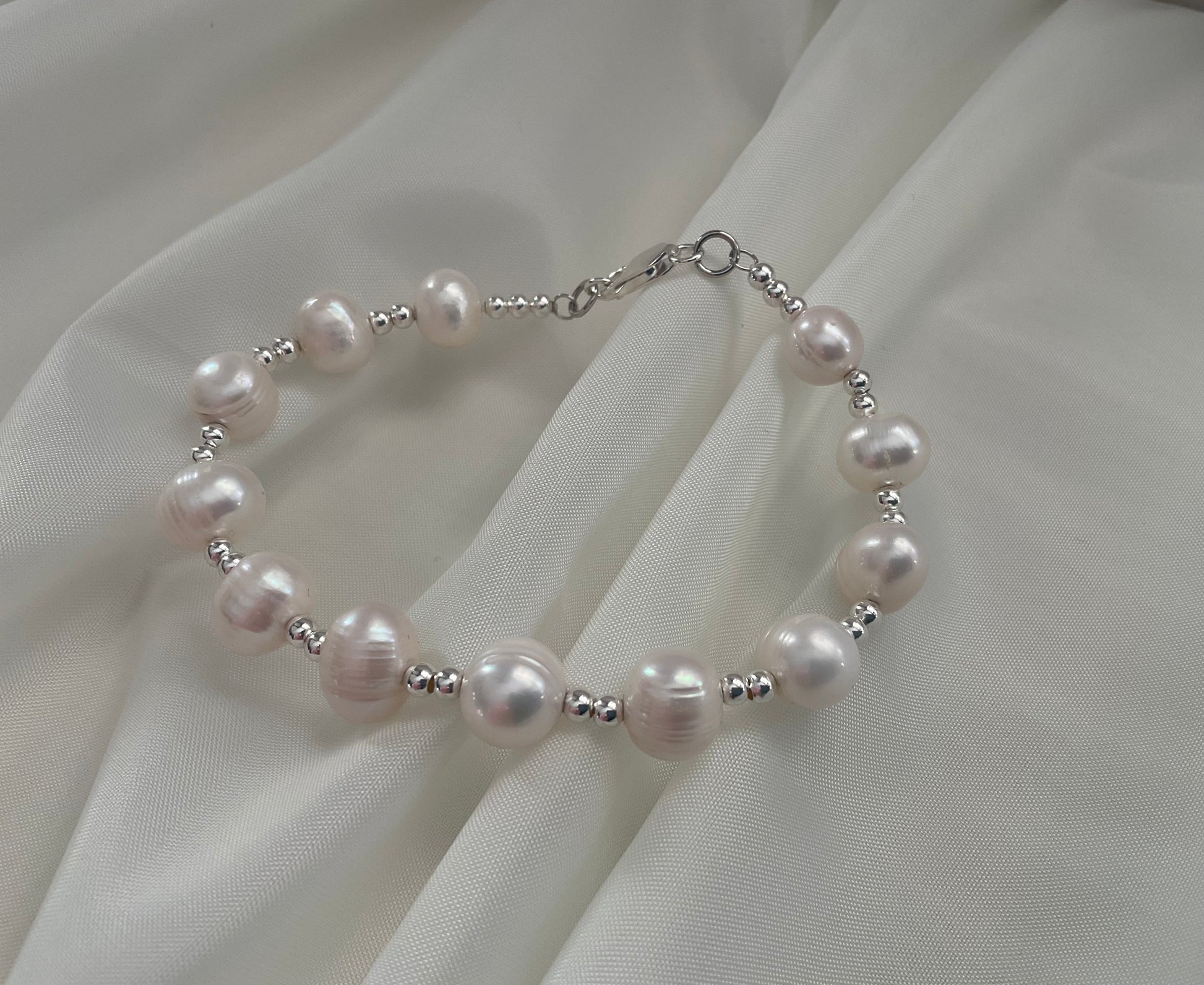 Handmade using luminous freshwater pearls, each bracelet is delicately spaced with polished sterling silver beads, creating a beautiful balance of softness and shine. The natural shape and gentle glow of the pearls ensure that no two pieces are ever exactly the same — a quiet reminder of their individuality.