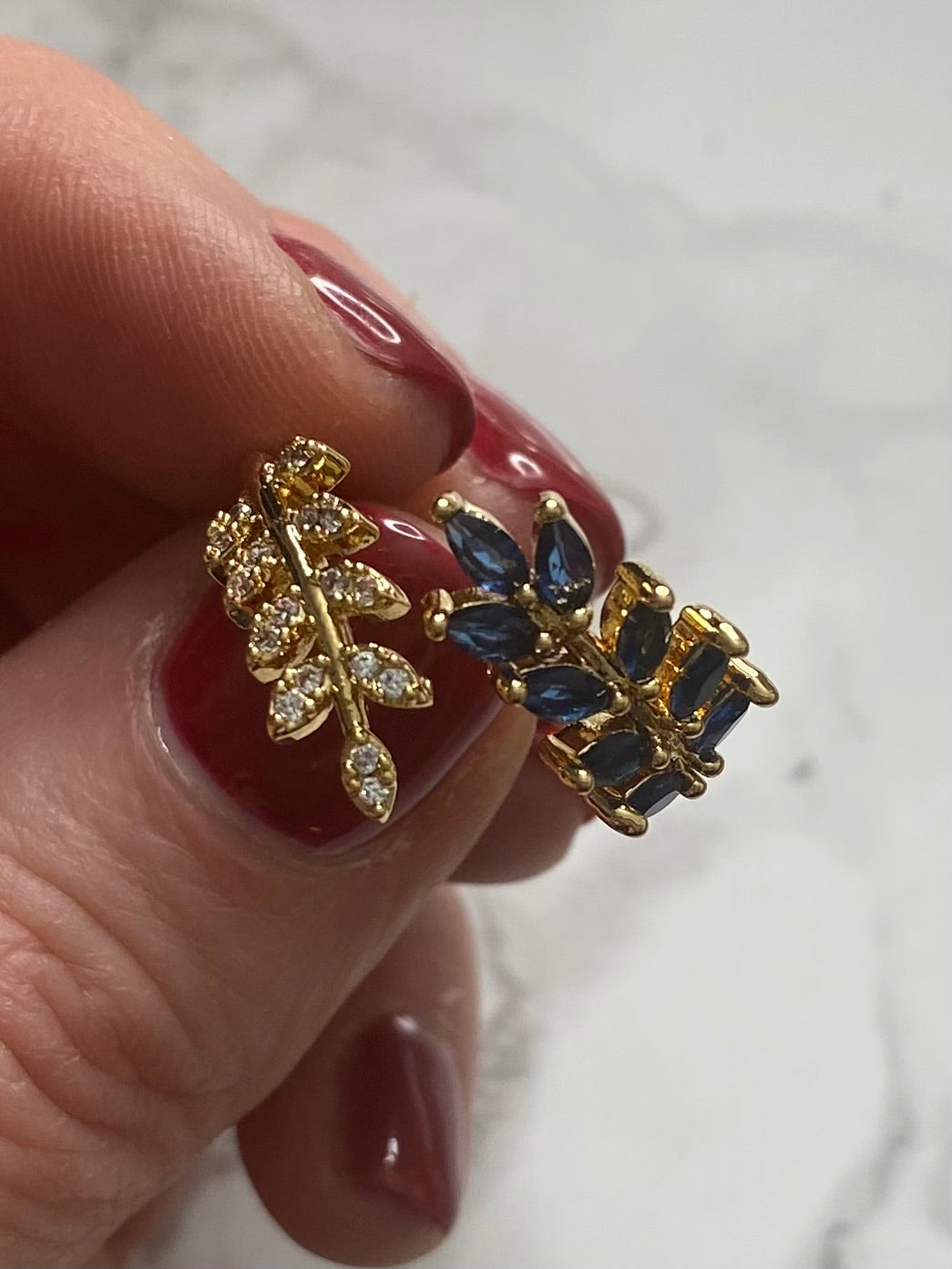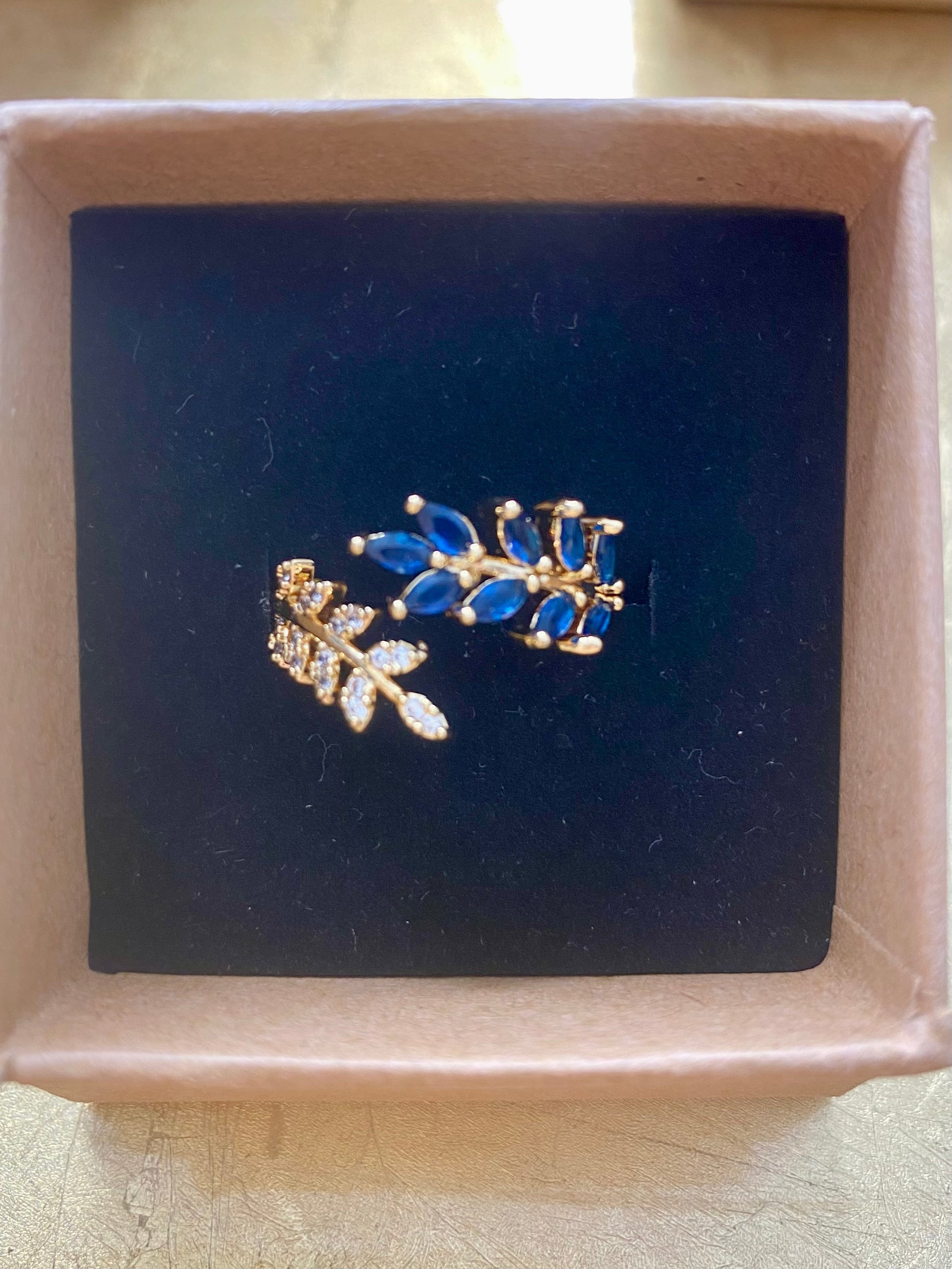 "Add a touch of whimsy to any outfit with our Leaf Ring! This stunning accessory features an adjustable band and colorful stones (green and clear in gold, blue and clear in silver) shaped like a leaf. Perfect for adding a pop of fashion to any look. One size fits all."
