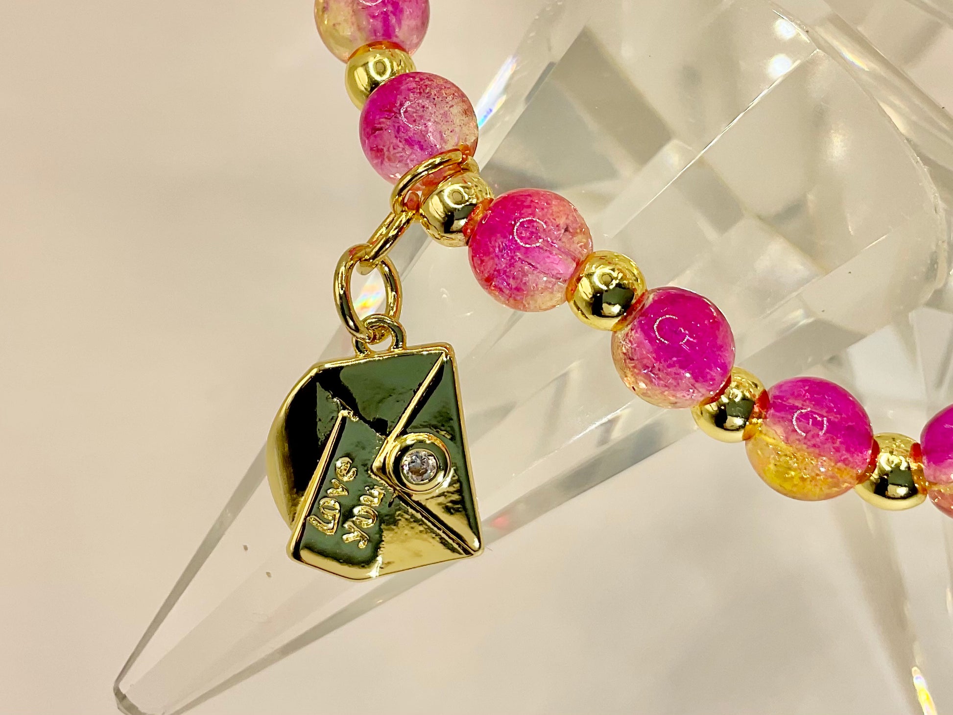 The Love Letter Bracelet is handcrafted with pink and gold glass beads and finished with a sweet envelope charm engraved with “Love You”.