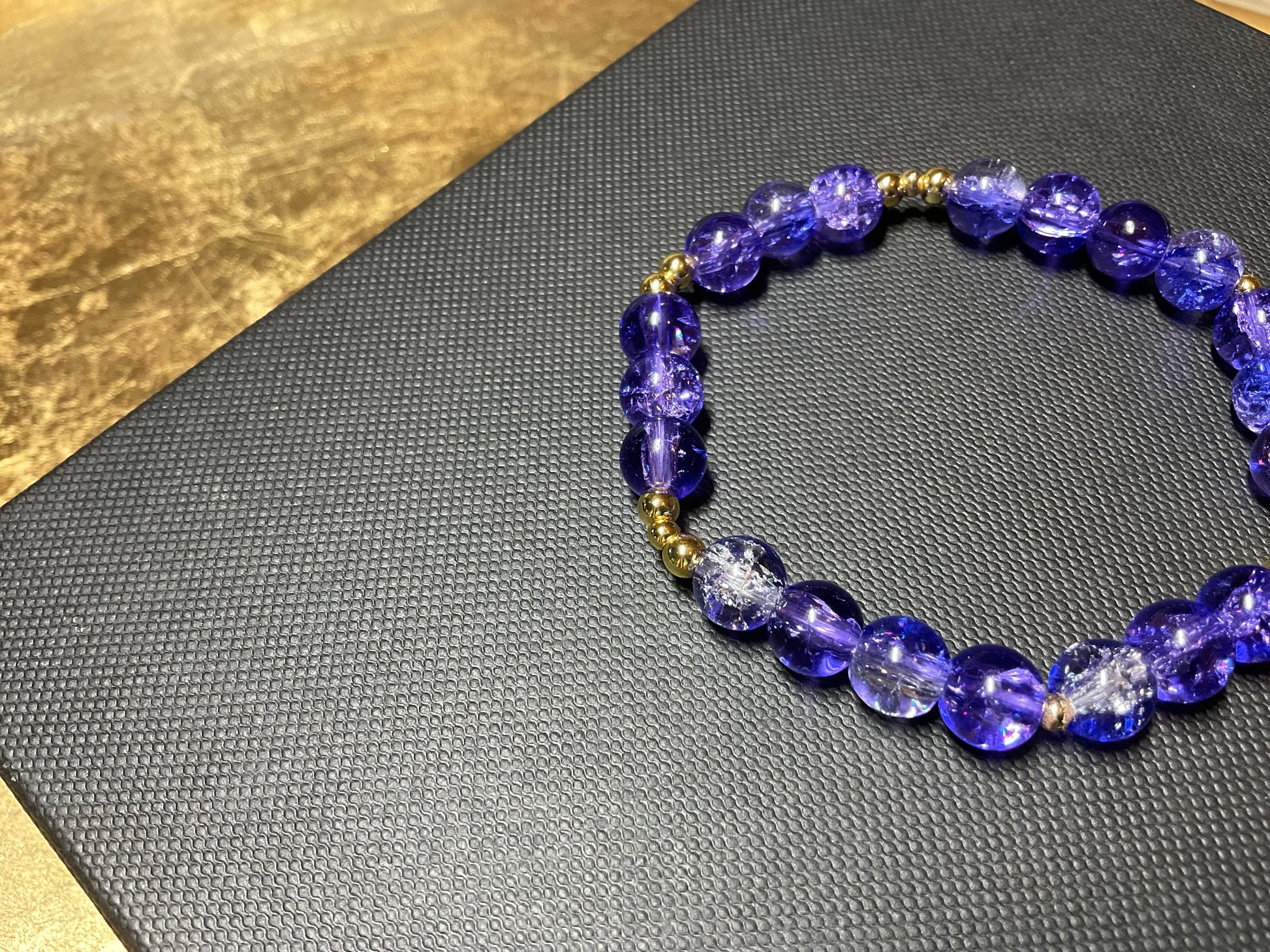 This purple dream of a bracelet features mesmerizing deep purple crackled glass beads accompanied by 18k gold plated accents. The gold colored clover charm adds a touch of luck and is hand made with love and attention to detail. With good stretch and crystal electric, this bracelet is a must-have!