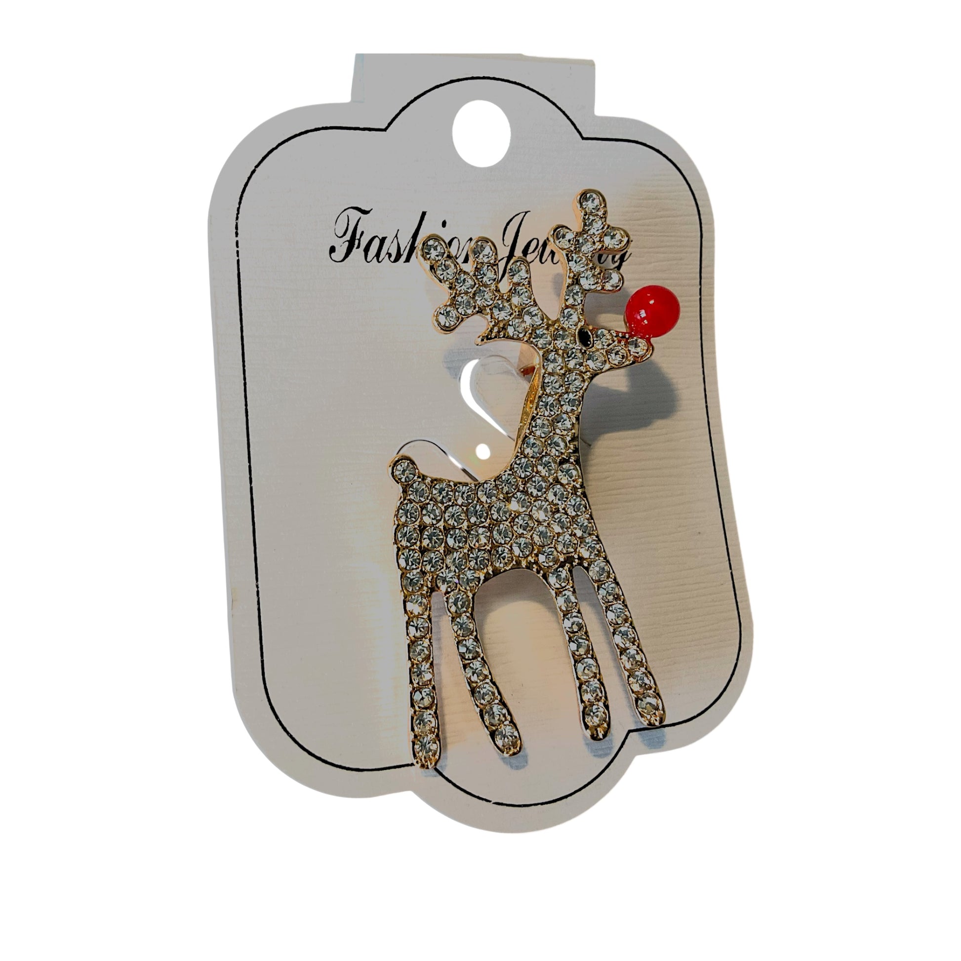 Add a playful touch to your Christmas outfit with this Red Nose Reindeer Rhinestone Brooch! The sparkling clear rhinestones give it a festive feel while the cute shiny red nose adds a touch of whimsy. Made with gold coloured metal and a pin fastener, this brooch is sure to set the bar high for holiday accessories. How cute!