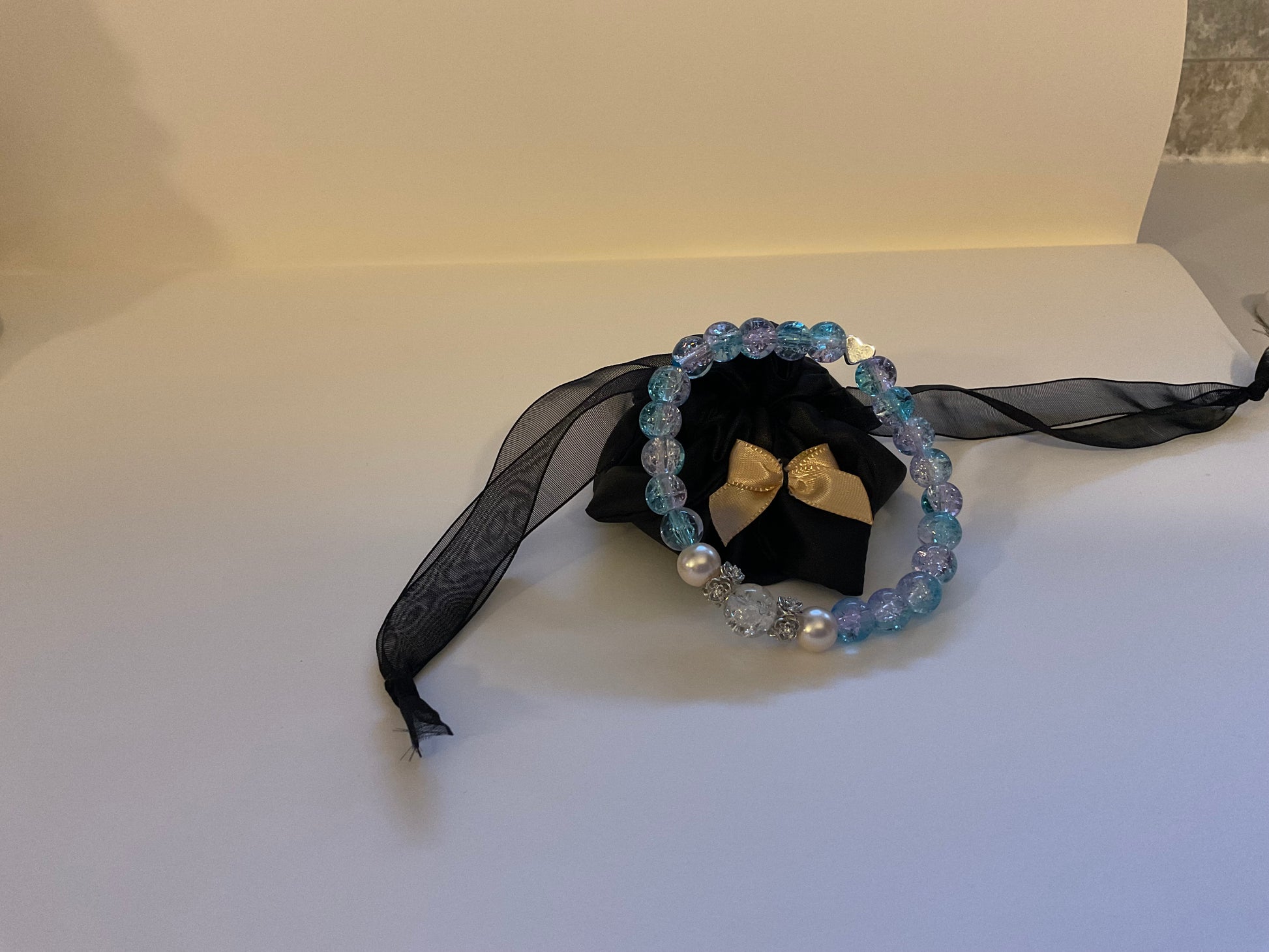 A beautifully balanced bracelet combining soft aqua glass beads with subtle lilac undertones. Accented with silver rose spacers set with clear gemstones, blush-toned faux pearls, and a polished silver heart bead for a timeless finish.