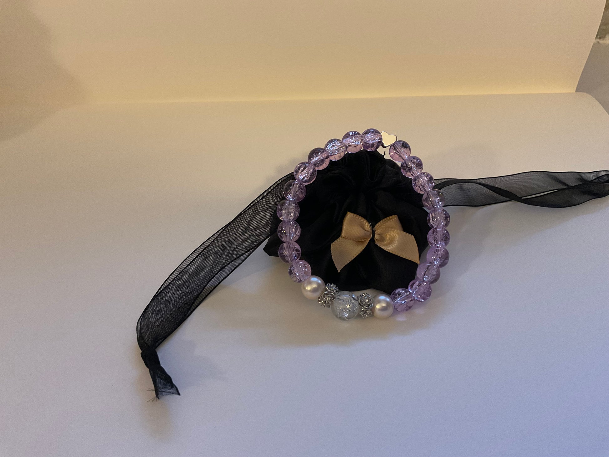 A softly romantic bracelet featuring lilac crackled glass beads, silver rose spacers with clear gemstone centres, and a delicate silver heart bead. Finished with creamy blush-toned faux pearls and a clear statement glass bead that catches the light beautifully.