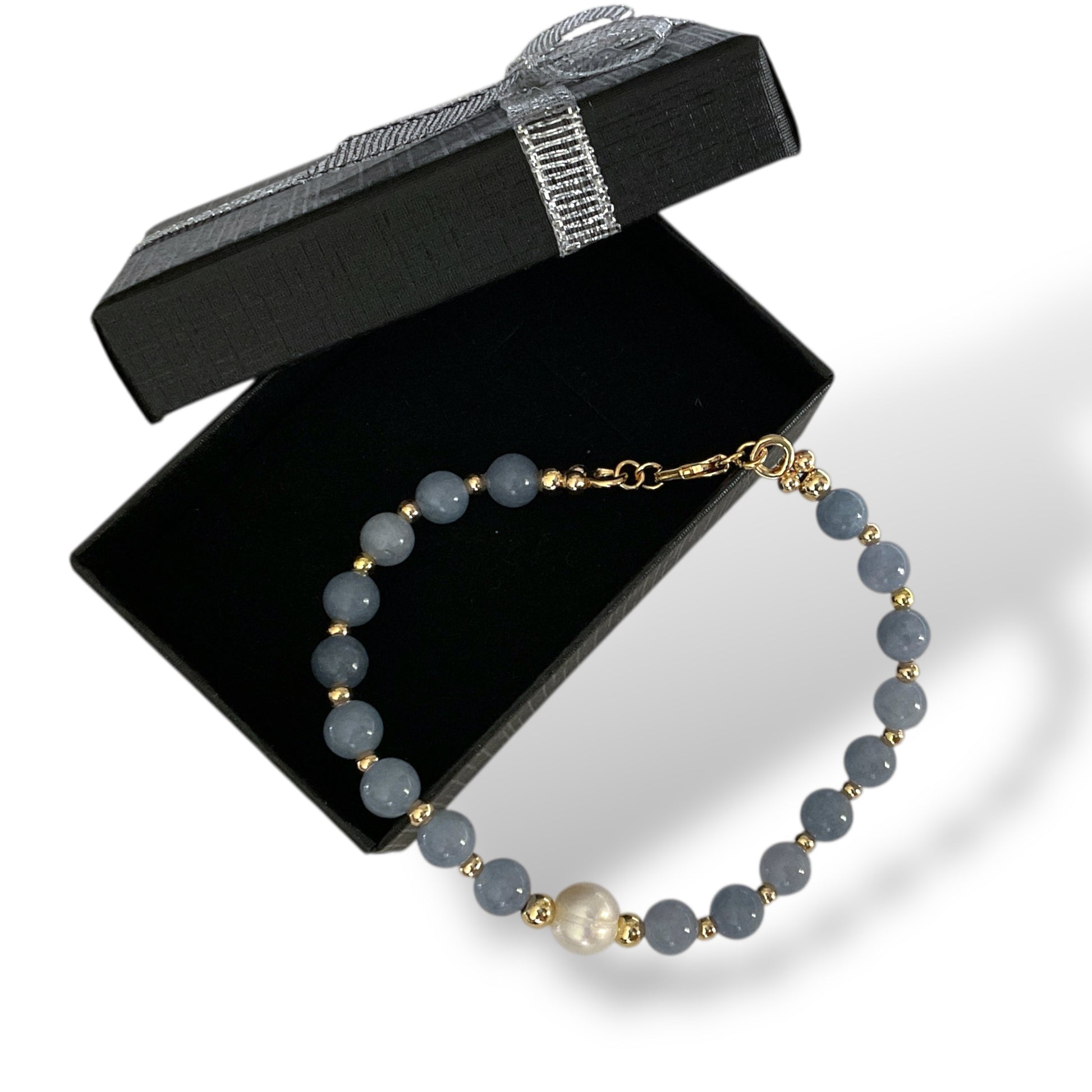 This elegant bracelet is made with soft, light blue stone beads and finished with a single freshwater pearl for a timeless, calming look.