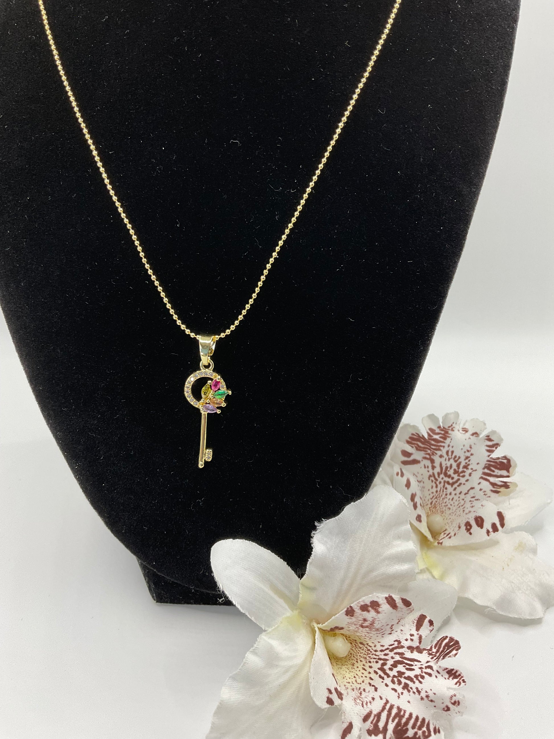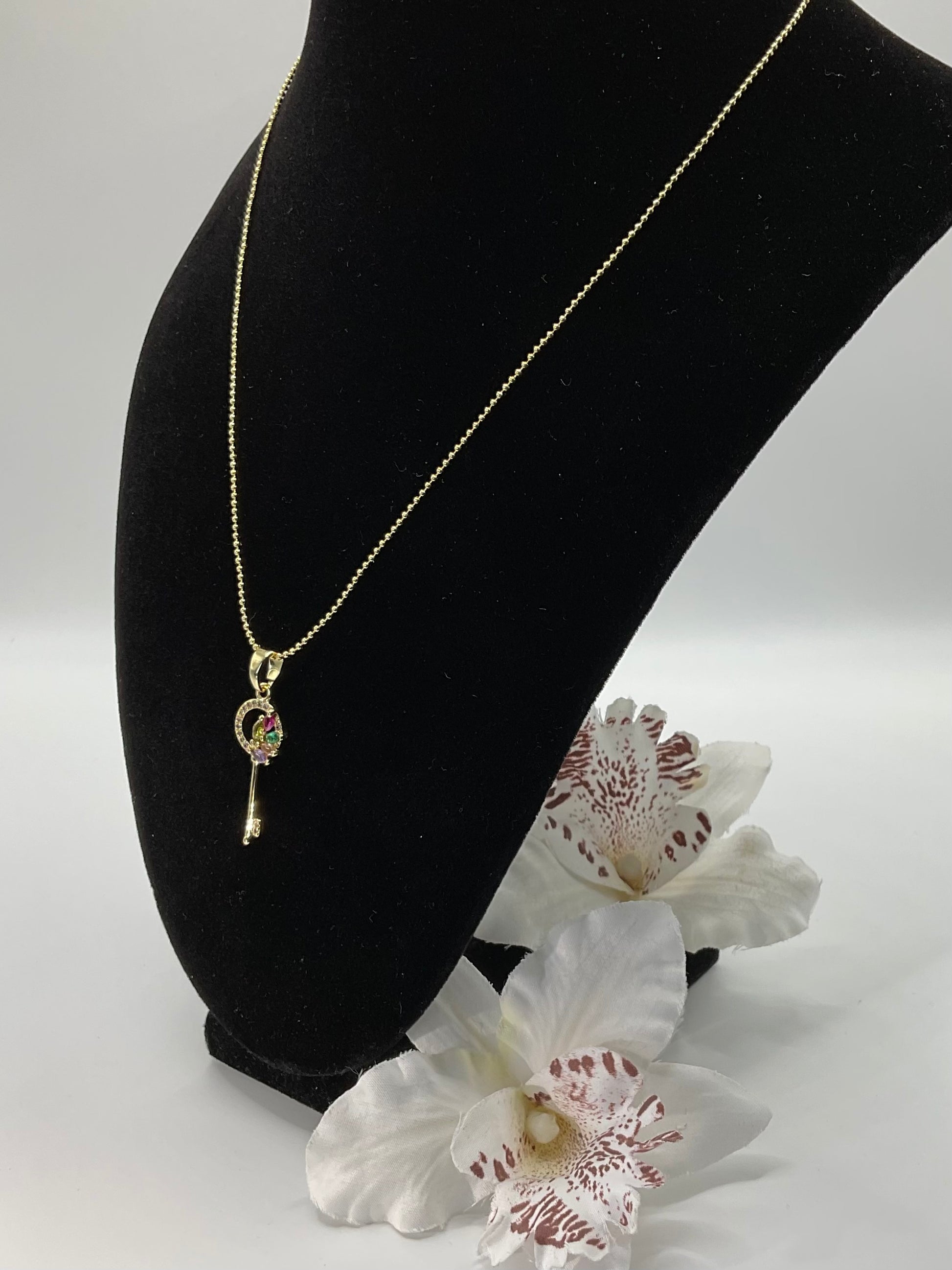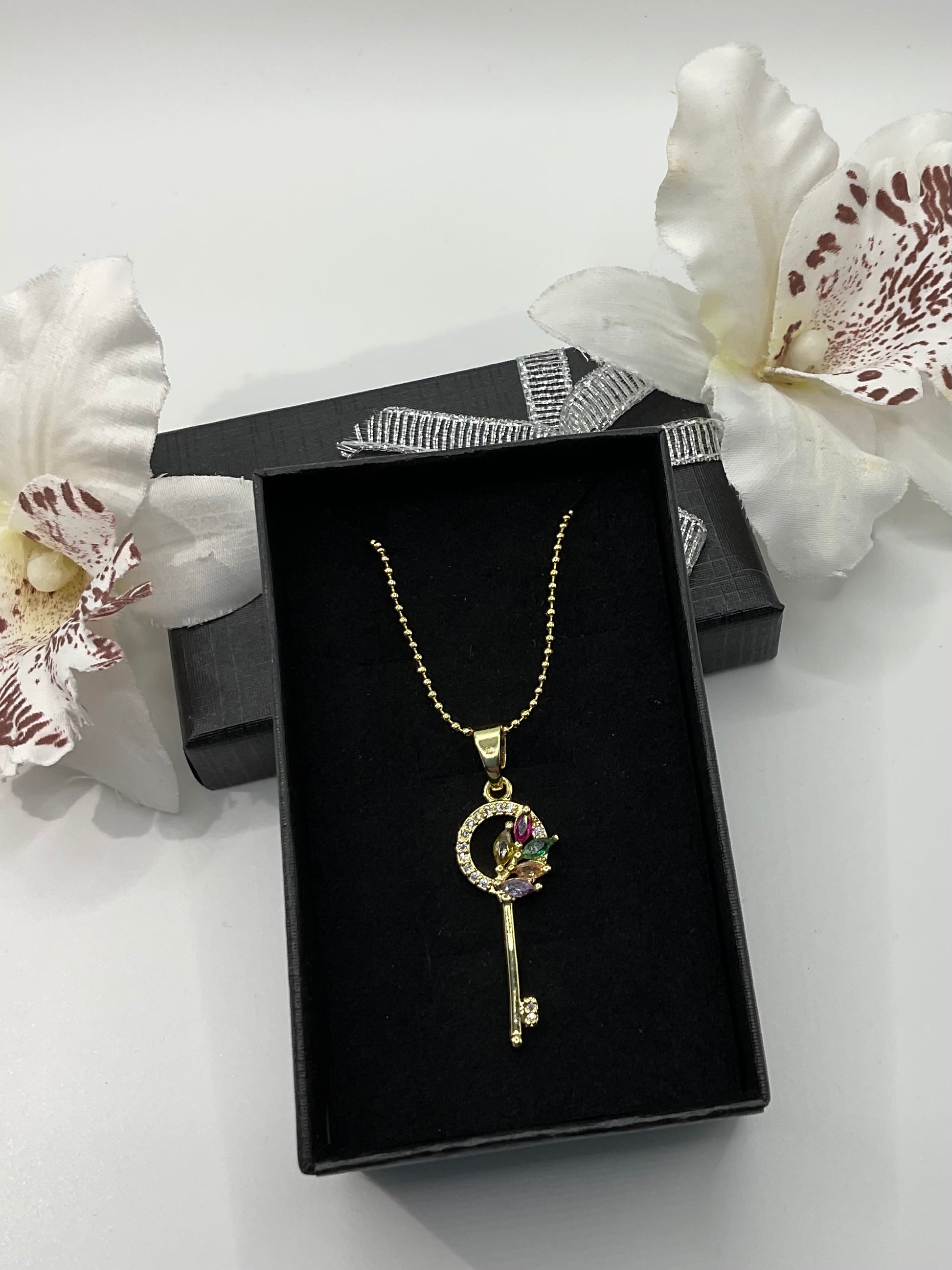 Crafted with an 18k gold-plated ball chain, this necklace features a beautifully detailed key charm adorned with sparkling clear and pastel-toned crystal stones in soft pink, green, lilac and yellow hues. The gentle pop of colour adds a delicate, feminine touch while keeping the piece timeless and wearable.