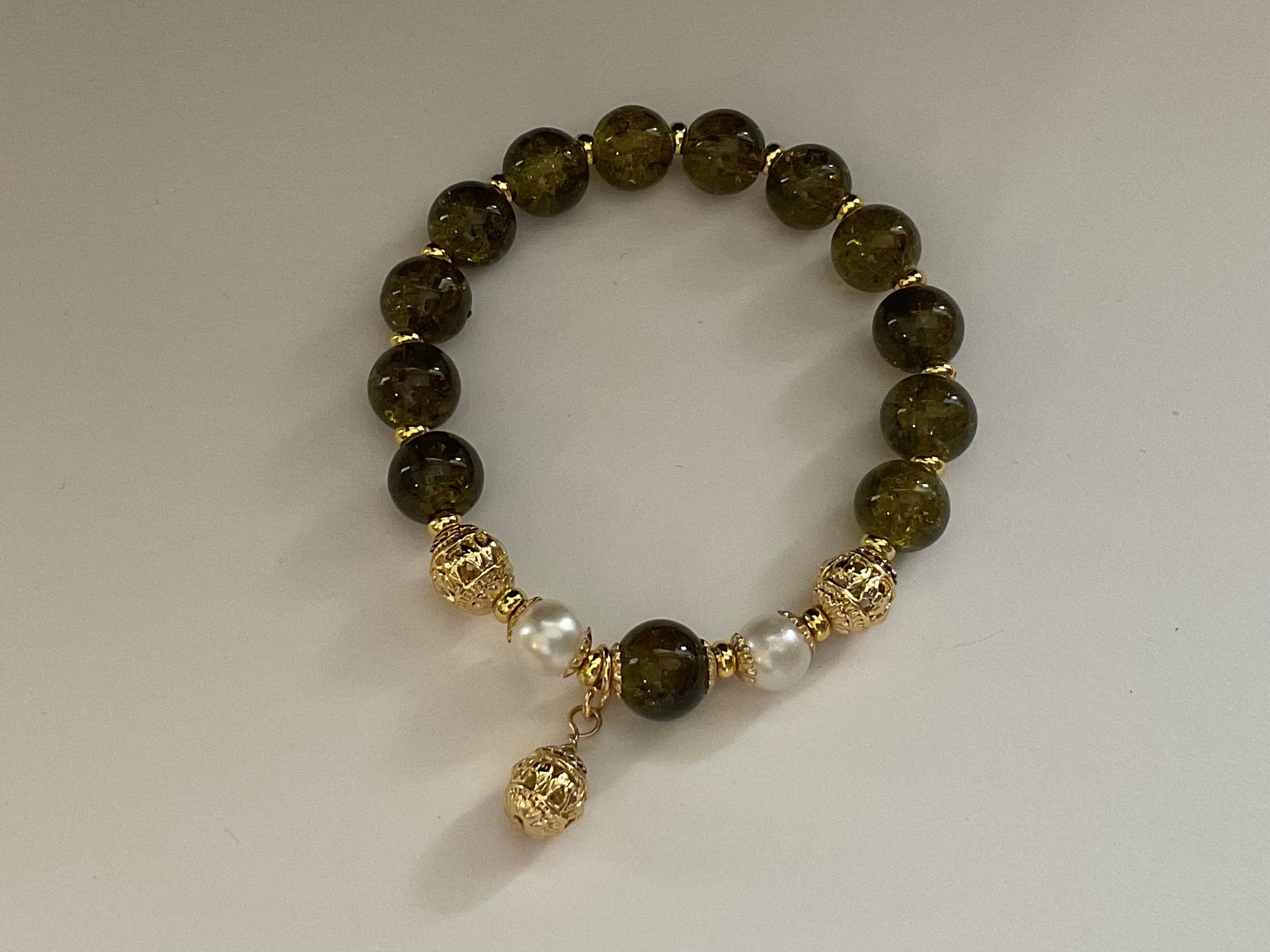 Crafted with deep olive crackle glass beads, this design carries a rich, antique glow—each bead catching the light with natural, gem-like texture. Ornate 18k gold-plated filigree beads add a touch of old-world grandeur, while shimmering faux pearls soften the palette with a delicate, classic finish.
