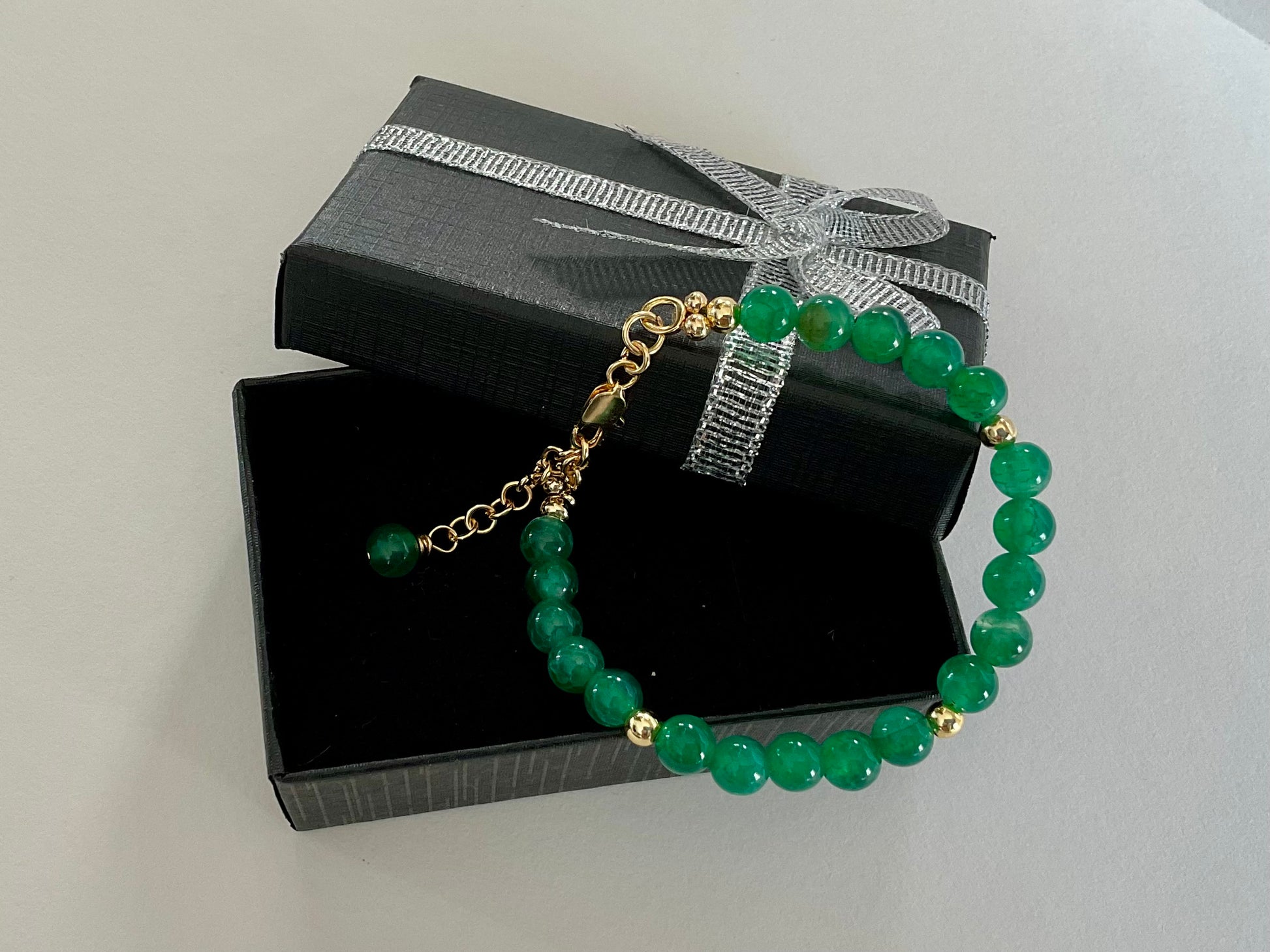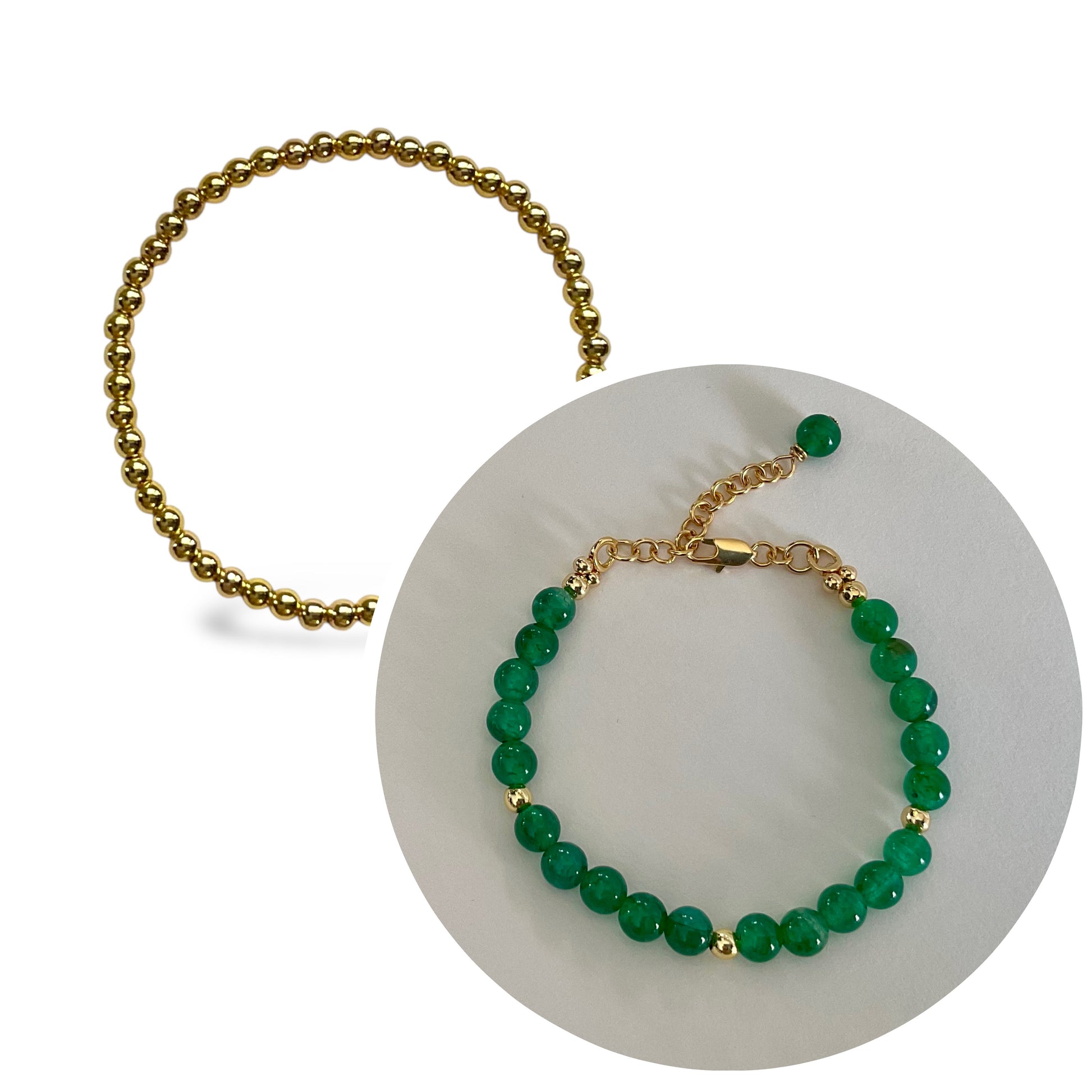 Set with rich green beads featuring natural variations — including subtle flecks and earthy undertones — no two beads are exactly the same, giving the bracelet depth and character. The stones are paired with 18k gold plated accents to add warmth and balance to the vibrant green.