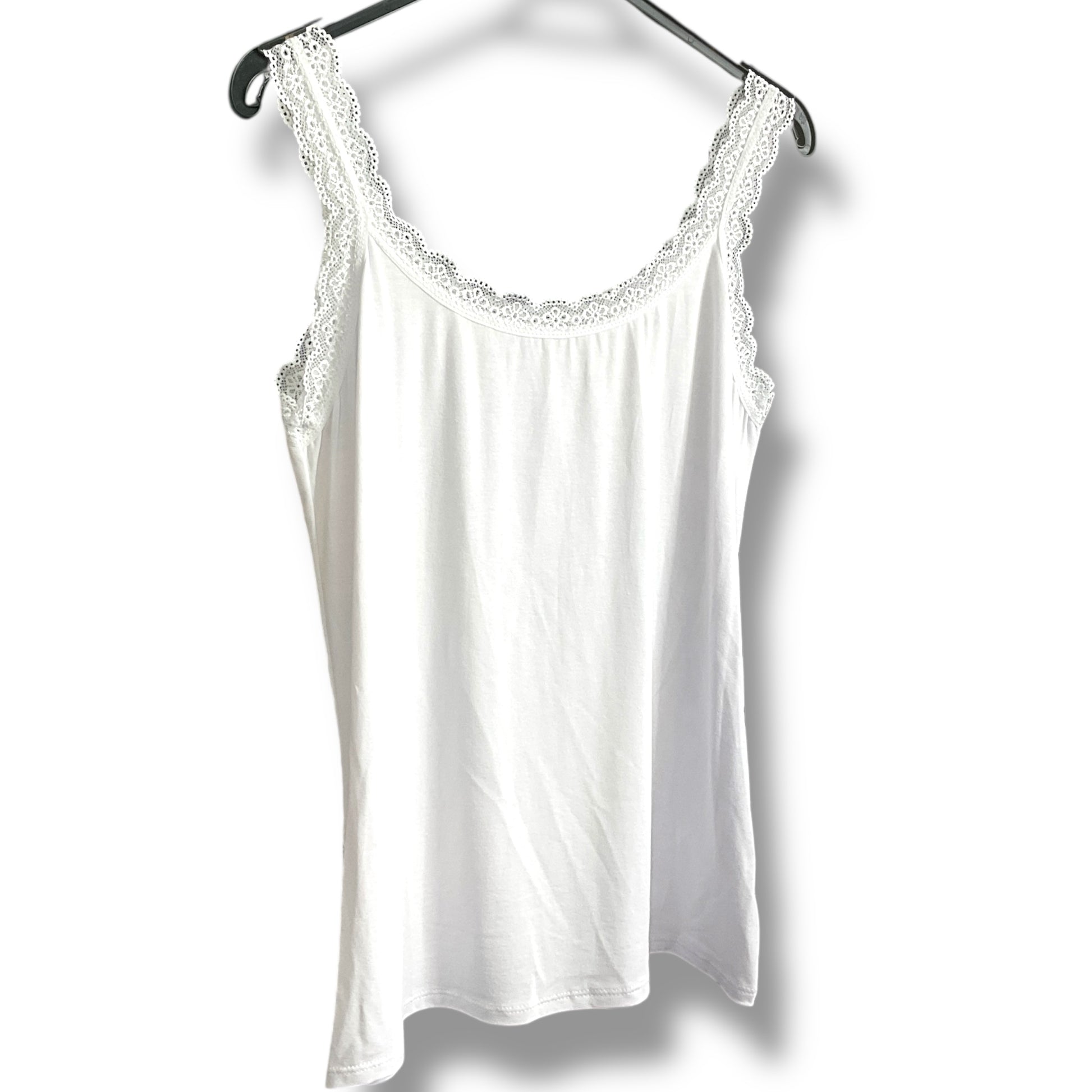 This essential vest top is soft and stretchy, making it perfect for everyday wear. The pretty daisy lace design adds a fun and feminine touch to the shoulder straps and neckline. Available in one size that fits sizes 8-12 (small 14). Say hello to your new go-to top!